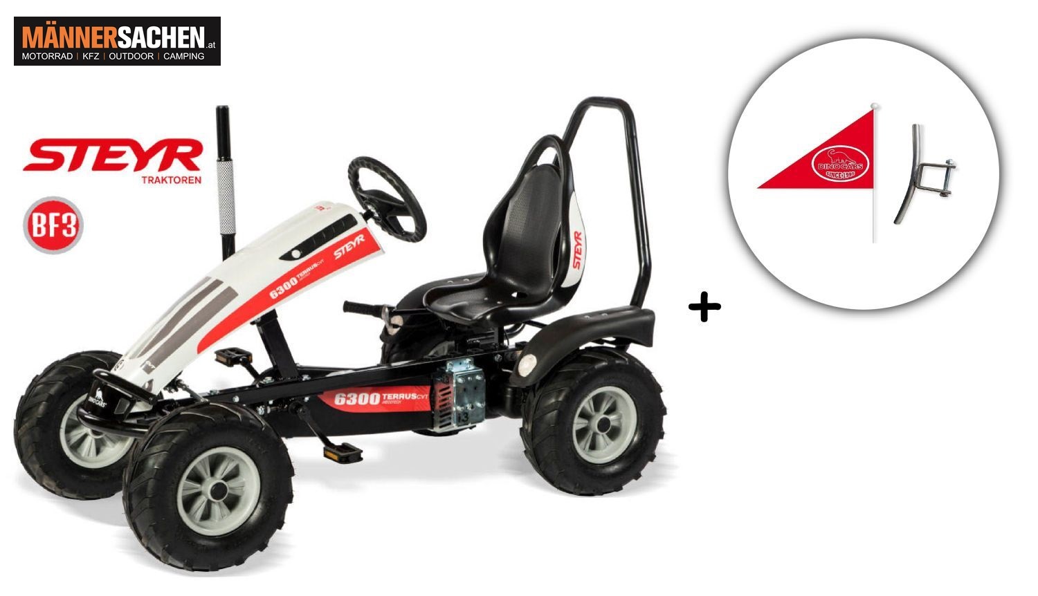 DINO STEYR BF3 - Der Perfekte! Die 3-Gangschaltung mit integrierter Ruecktrittbremse laesst die Vor- und Rueckwaertsfahrt ohne weiteres Umschalten zu. Ausserdem verhindert der BF3 Antrieb das Mitdrehen der Pedale waehrend der Vorwaertsfahrt. Die Fahrer koennen somit Tretpausen waehrend der Vorwaertsbewegung einlegen. Hierdurch wird das Verletzungsrisiko minimiert. Zum Rueckwaertsfahren bremst man das Go-Kart intuitiv mit den Pedalen oder mit der Handbremse, bis es zum Stillstand kommt. Danach werden die Pedale rueckwaerts getreten. Der Rueckwaertsgang legt sich automatisch ein. Mit Hilfe der integrierten 3-Gangschaltung kannst du auch in steilerem Gelaende das Kart jederzeit leicht bewegen. Das ist Fahrspass und Sicherheit pur.