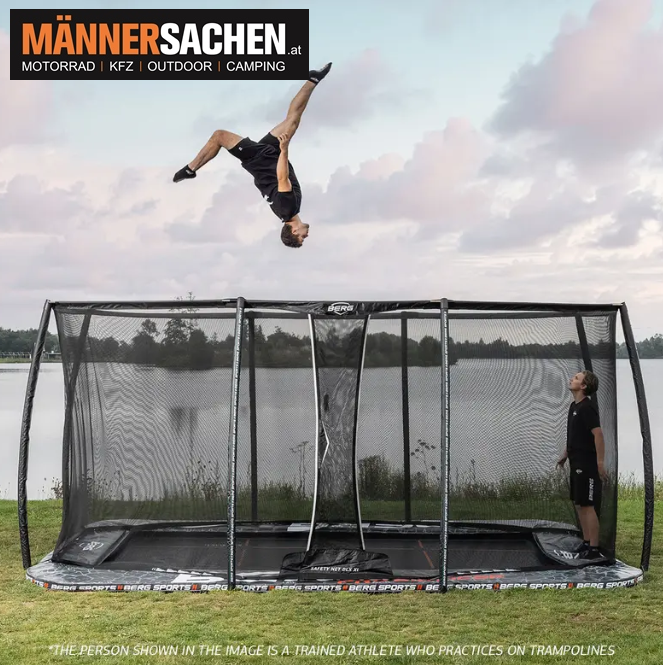 Das BERG SPORTS Ultim Pro Bouncer FlatGround 500 + Safety Net XL ist ein hochwertiges, rechteckiges Trampolin mit den Maßen 500 x 300 cm.