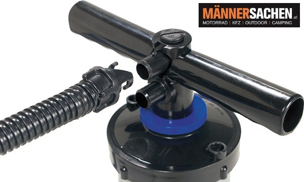 Inkl. Schlauch mit Bajonettanschluß (gegen unbeabsichtigtes Ablösen des Schlauchs), Ventiladapter 6-teilig und Spitzadapter für Luftmatratzen u.s.w.