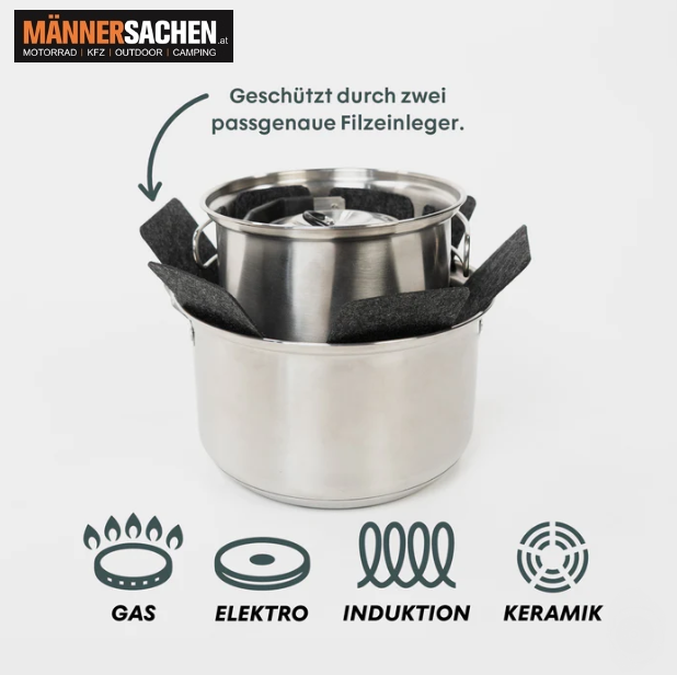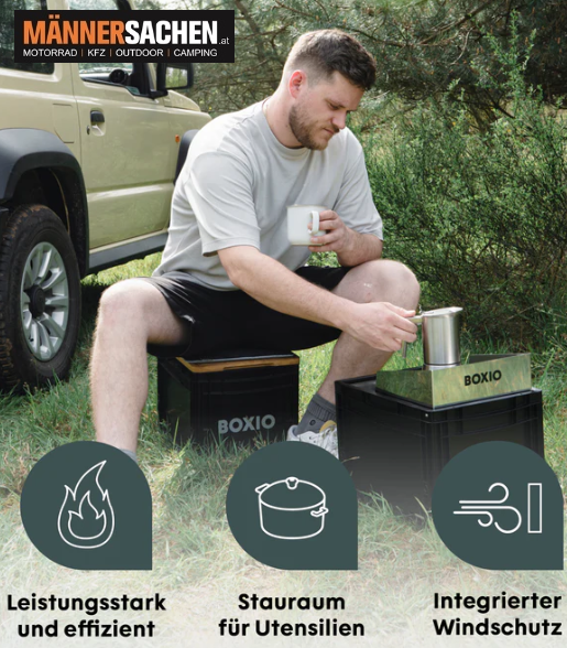 Die BOXIO COOK PLUS ist ein premium Gaskocher fürs Outdoor-Kochen und wird mit dem passenden Edelstahl-Topfset geliefert.