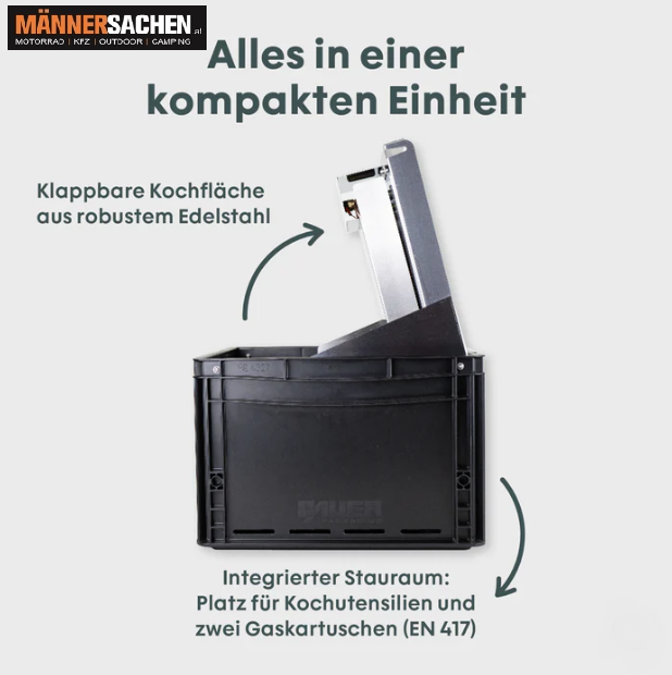 Das praktische Design in der Eurobox kombiniert mit einer Edelstahl-Konstruktion mit regulierbarer Gasflamme und Stauraum für Kochutensilien und Gaskartuschen (nicht im Lieferumfang enthalten) sorgt für Sicherheit und Komfort.