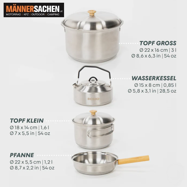 - Cookware (Töpfe, Pfannen und Wasserkocher) lassen sich ineinander stapeln