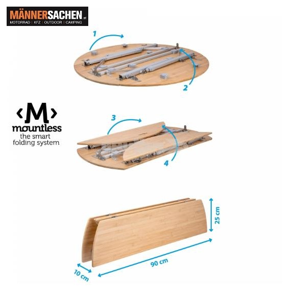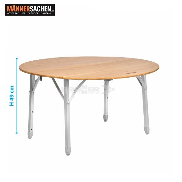 Runder Outdoor- und Campingtisch mit 4-fach klappbarer Tischplatte aus elegantem Bambusholz und höhenverstellbarem Gestell aus Aluminium.