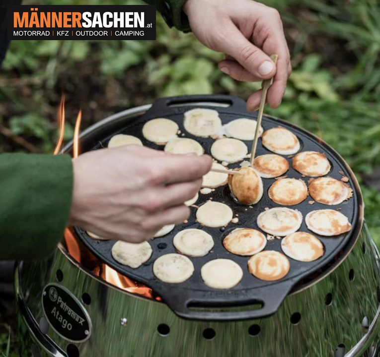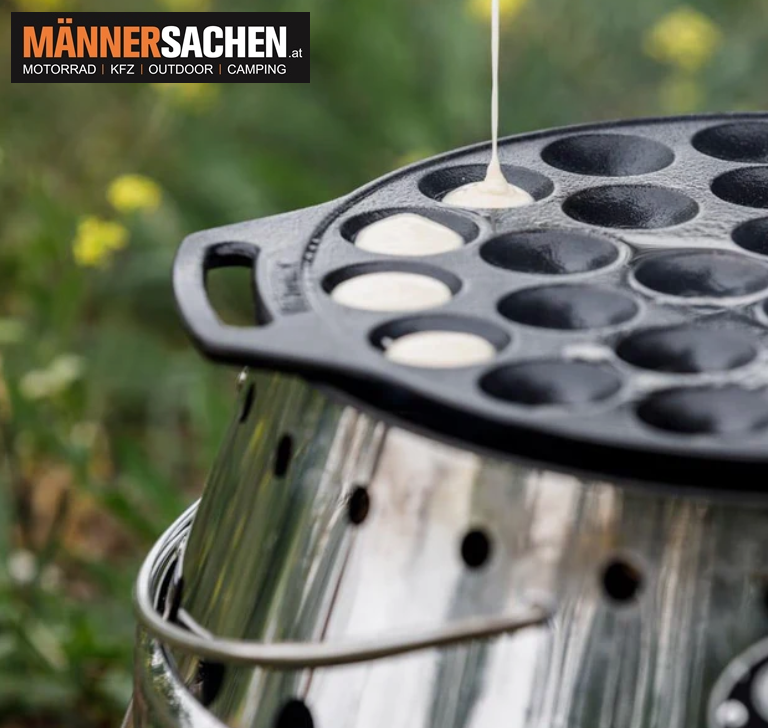 Mit der Poffertjespfanne backst du 30 niederländische Mini-Pfannkuchen gleichzeitig am Lagerfeuer.