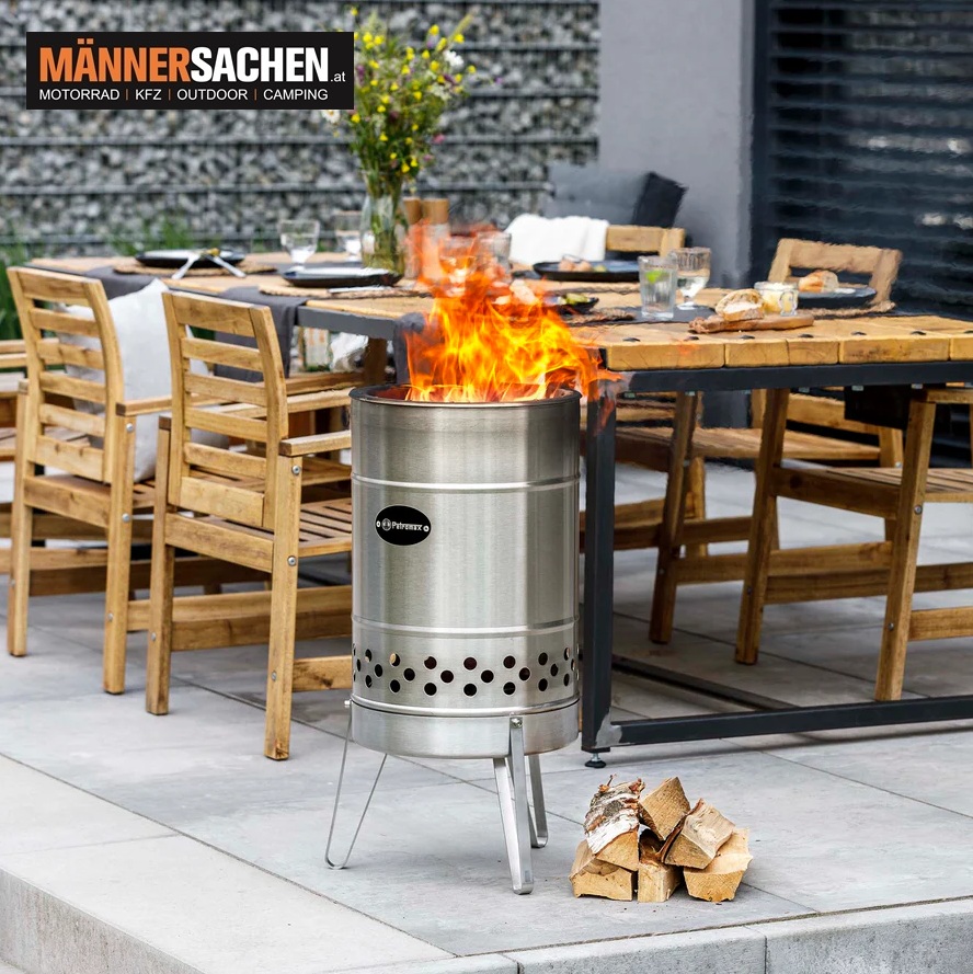 Erlebe das Abenteuer direkt in deinem Garten oder auf der Terrasse mit der Feuertonne Pyron. Ob allein oder in geselliger Runde – genieße die beruhigende Atmosphäre des Feuers und warme, entspannte Abende im Freien. Die Feuertonne Pyron kombiniert robustes Design mit modernster Technik. Sie bietet ein raucharmes Feuer mit maximalem Komfort und einem präzisen Luftzufuhrsystem für eine saubere Verbrennung. Dank der doppelwandigen Konstruktion und dem fortschrittlichen Sekundärverbrennungssystem werden unverbrannte Gase und Partikel effektiv reduziert, damit du dich ganz auf das Feuererlebnis konzentrieren kannst. Mit ihren drei stabilen Beinen sorgt die Feuertonne für einen festen Stand und schützt den Untergrund dank genügend Abstand vor Hitze . Wenn du gerne kochst oder grillst, kannst du den Pyron mit der Pypla Grillplatte erweitern. Die unterschiedlichen Wärmezonen der Grillplatte bieten dir vom scharfen Anbraten bis zum sanften Nachgaren maximale Flexibilität. Die Feuertonne Pyron ist perfekt für alle, die das Gefühl von Abenteuer und Wildnis in ihrem Alltag erleben wollen.    Durchmesser am oberen Rand (innen): ca. 29,5 cmDurchmesser am oberen Rand (außen): ca. 36,5 cmBenötige Standfläche: 44,5 cmHöhe mit Standbeinen: 74 cm Volumen für Brennmaterial: 25 LiterProduktmaße (h x b x t): 74,0 x 44,5 x 44,5 cmFarbe: Edelstahl   Für Fragen stehen wir sehr gerne zur Verfügung !  0676 9119990