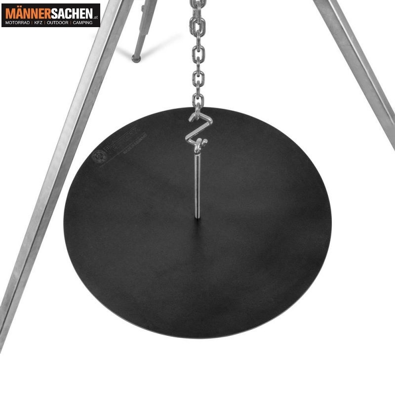 Mit der Hänge-Feuerschale kombinierst du das Kochen, Braten und Garen über offenem Feuer mit echter Wild West Küche: Mittels der Stab-Öse hängst du die Schale sicher und schnell an den Haken deines Dreibeins. So über deiner Feuerstelle positioniert, kommt der Stahl im Handumdrehen auf Temperatur. Dabei brät dein Fleisch besonders schonend, da Sud und Saft erhalten bleiben. Bestimme die benötigte Hitze ganz nach deinen Bedürfnissen, indem du den Abstand zum Feuer mit der Länge der Dreibeinkette regulierst. Wie beim Kochen mit den Petromax Grill- und Feuerschalen entstehen auch hier unterschiedliche Garzonen, die dir das Braten von Filets in der Mitte und das schonende Gemüsegaren oder Warmhalten von Speisen am Rand möglich machen. Mit einem Durchmesser von gut 56 cm versorgst du so dich und deine Truppe von Gesetzlosen mit einer großen Auswahl unterschiedlicher Gerichte unter freiem Himmel.