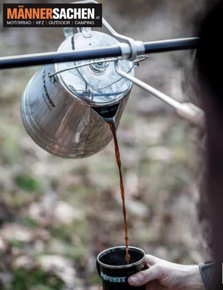 Über dem Feuer kocht wie gewohnt dein kräftiger Kaffee oder aromatischer Tee und mit einer simplen Kippbewegung schenkst du der müden Meute – einem nach dem anderen – eine wärmende Tasse ein. So geht kein Tropfen mehr daneben. Da die Ausgießhilfe mit einem Griffstück aus naturbelassenem Buchenholz versehen ist, ist dir der sichere Umgang mit der heißen Kanne garantiert.