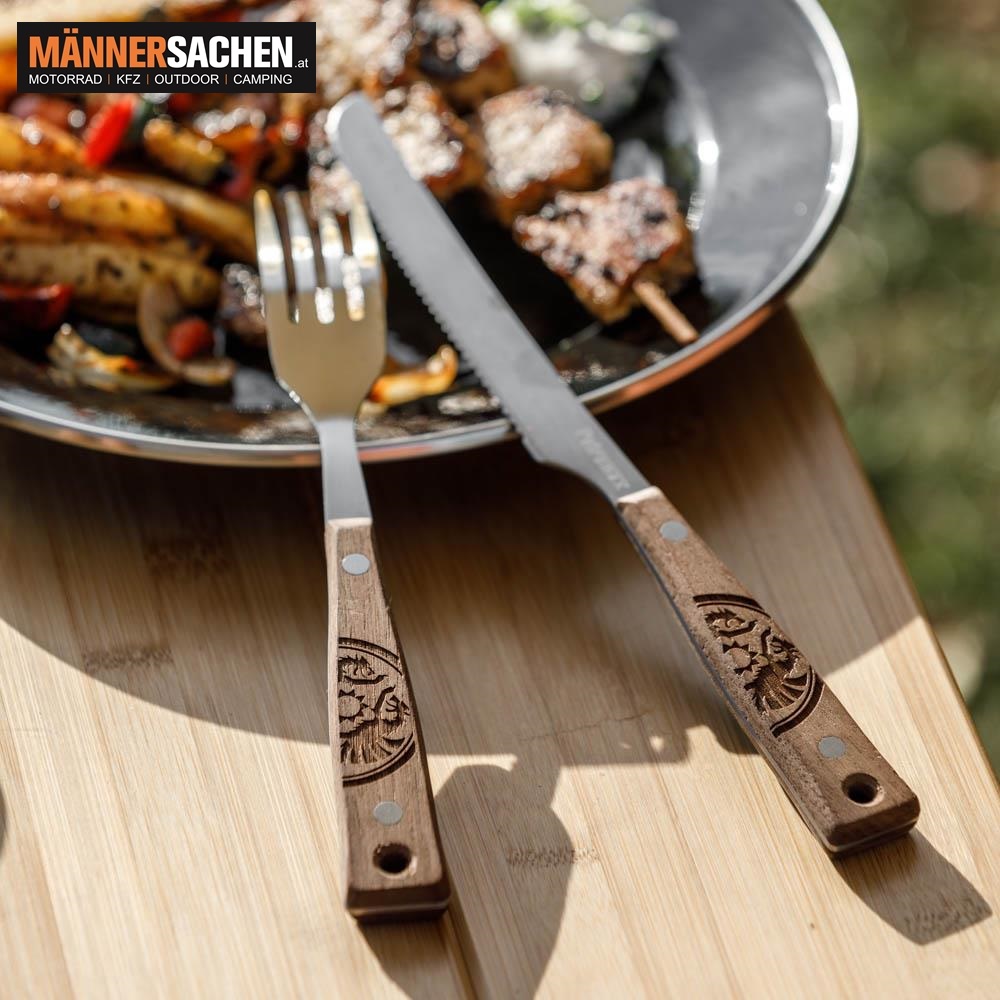 Dank des hochwertigen Messers mit Doppelwellenschliff auf der rechten Seite kannst du dein frisch gegrilltes Fleisch mühelos schneiden und durch die abgerundete Form und breite Klinge ideal zum Verstreichen von Kräuterbutter und Co. nutzen. Im Set mit Löffeln und Gabeln bietet dir das scharfe Messer das passende Werkzeug für jeden Einsatz. Das Camping Besteck Set mit Griffen aus Echtholz: ursprünglicher Charakter für die Draußen-Küche Das Camping Besteck mit dem gelaserten Petromax-Schriftzug ist nicht nur funktional, sondern passt durch seinen ursprünglichen Charakter ideal in deine Draußen-Küche. Individuell kannst du dein Camping Besteck durch ein Band gestalten, das du durch die Öse ziehst, um es in deinem Camper oder an deinem Rucksack aufzuhängen. Der hochwertige Edelstahl lässt sich einfach per Hand mit Spülmittel und Wasser reinigen. Mit dem Petromax Camping Besteck hast du für jede Mahlzeit das passende Besteck zur Hand und genießt dein Abenteuer-Menü, wo immer du gerade bist.