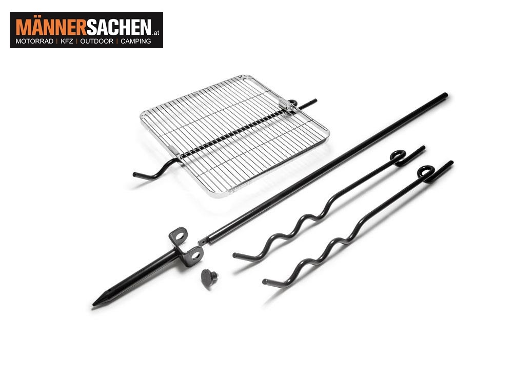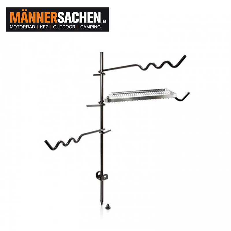 Dein Feueranker verfügt über eine Hauptstange, die im Boden fixiert wird, und drei Arme, die du individuell auf den Feueranker aufstecken und in Höhe sowie Ausrichtung variieren kannst. Zwei der Arme haben Einkerbungen an den Enden, an denen du deine Kochutensilien anhängen kannst. Der dritte Arm verfügt über einen Grillrost sowie eine zusätzliche Einkerbung für deine Grillhandschuhe oder die Grill- und Kohlenzange. Auf dem großzügigen Grillrost mit erhöhten Rand finden Würstchen, Gemüsespieße und Co. sicher Platz.
