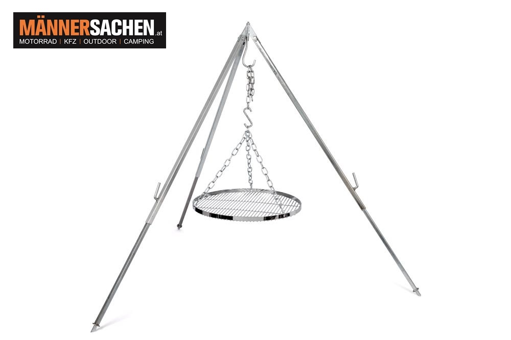 Mittels der drei stabilen Ketten wird der verchromte Stahlrost mit einem Handgriff an deinen Dreibeinhaken gehängt und ist direkt einsatzbereit.