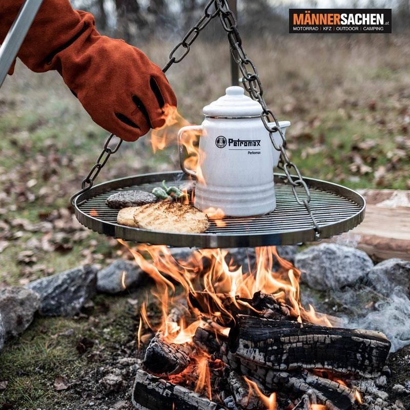Der Hänge-Rost für das Petromax Dreibein erweitert deine Draußen-Küche um ursprüngliche Grillerlebnisse am Lagerfeuer.