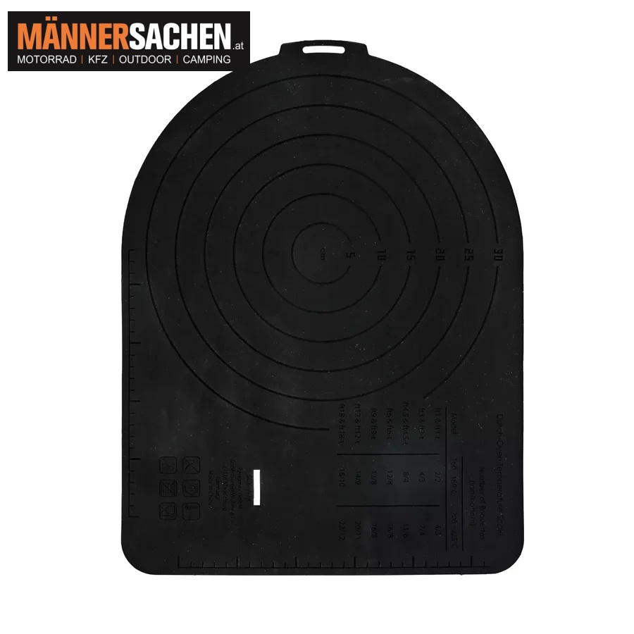 Dank ihrer robusten Konstruktion eignet sich diese Matte hervorragend für Feuertöpfe, sowohl mit als auch ohne Füße. Die auf der Rückseite integrierte Kreisschablone ermöglicht es dir, Teig mühelos und auf die perfekte Größe zu formen. Außerdem hilft die Brikett-Anzeige dabei, die optimale Hitze für deinen Dutch Oven zu erreichen.