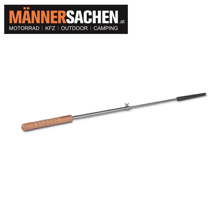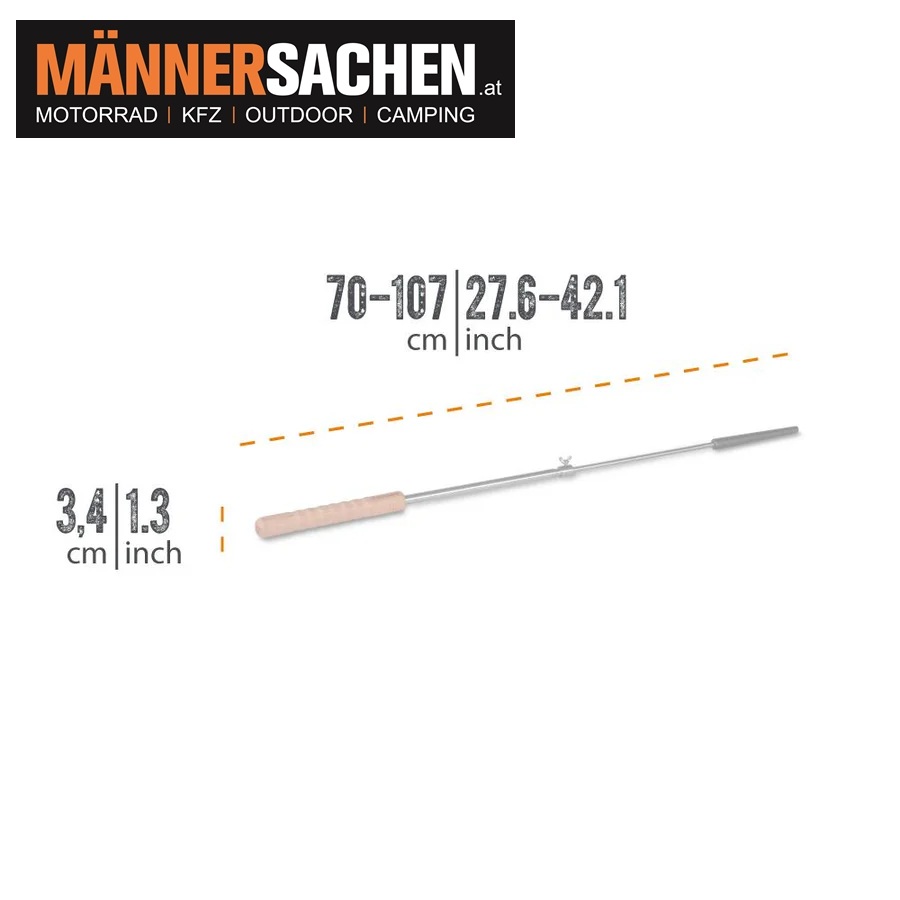 Für den richtigen Abstand zum Feuer sorgt der stufenlos einstellbare Teleskopstab, der mit Hilfe der Flügelschraube auf eine Länge von 70 cm bis 107 cm ausgezogen werden kann.