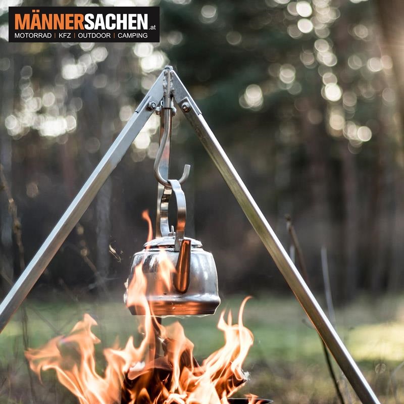 - austarierter Henkel für die sichere Handhabung und zum Aufhängen über dem Feuer