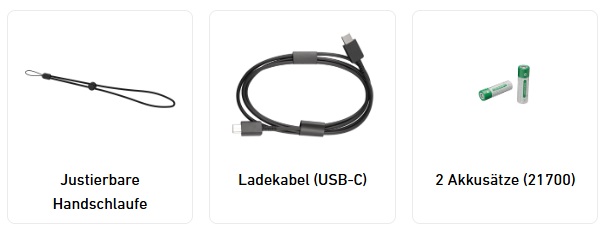Lieferumfang: Handschlaufe, Ladekabel, 2 Akkusätze (21700)