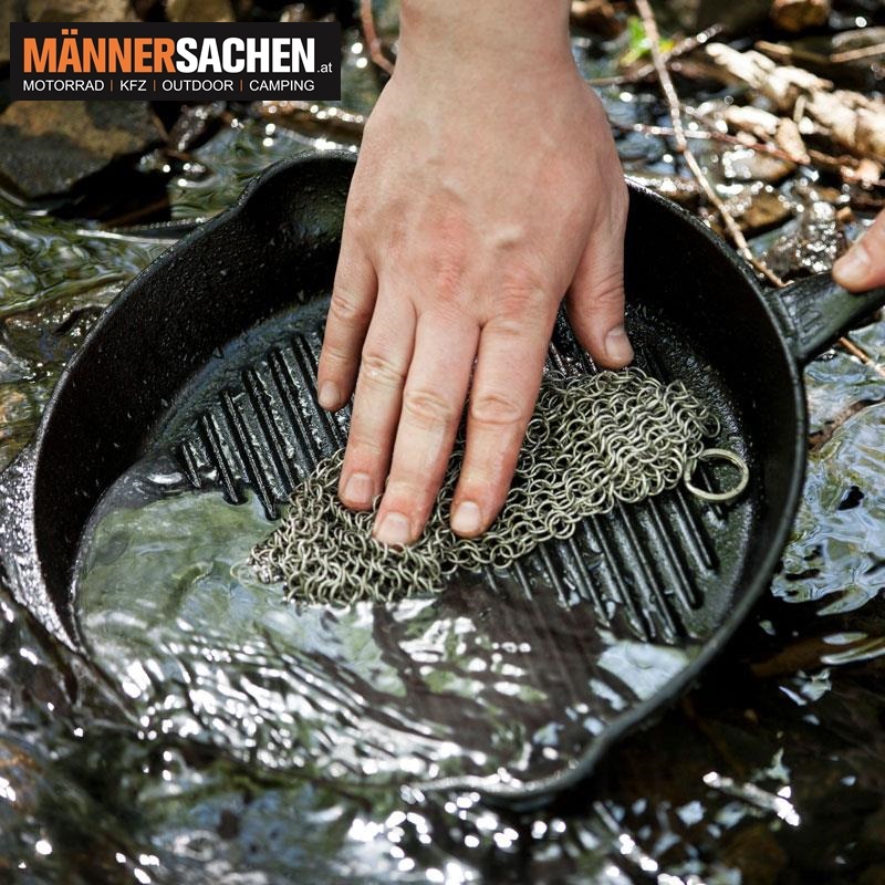 Kochgeschirr abkühlen lassen, eventuell kurz einweichen lassen und mit warmem Wasser und dem Ringreiniger schonend die angebrannten Rückstände abreiben. Spülmittel brauchst du natürlich nicht. Nach dem Säubern nochmals gründlich abspülen. Bevor du dein guss- oder schmiedeeisernen Kochgeschirr wieder in der Schrank stellst, stets gut abtrocknen und wie gewohnt pflegen. Auch der Ringreiniger sollte nach dem Gebrauch gut abgetrocknet werden. (Achtung: Kontaktkorrosion möglich!)