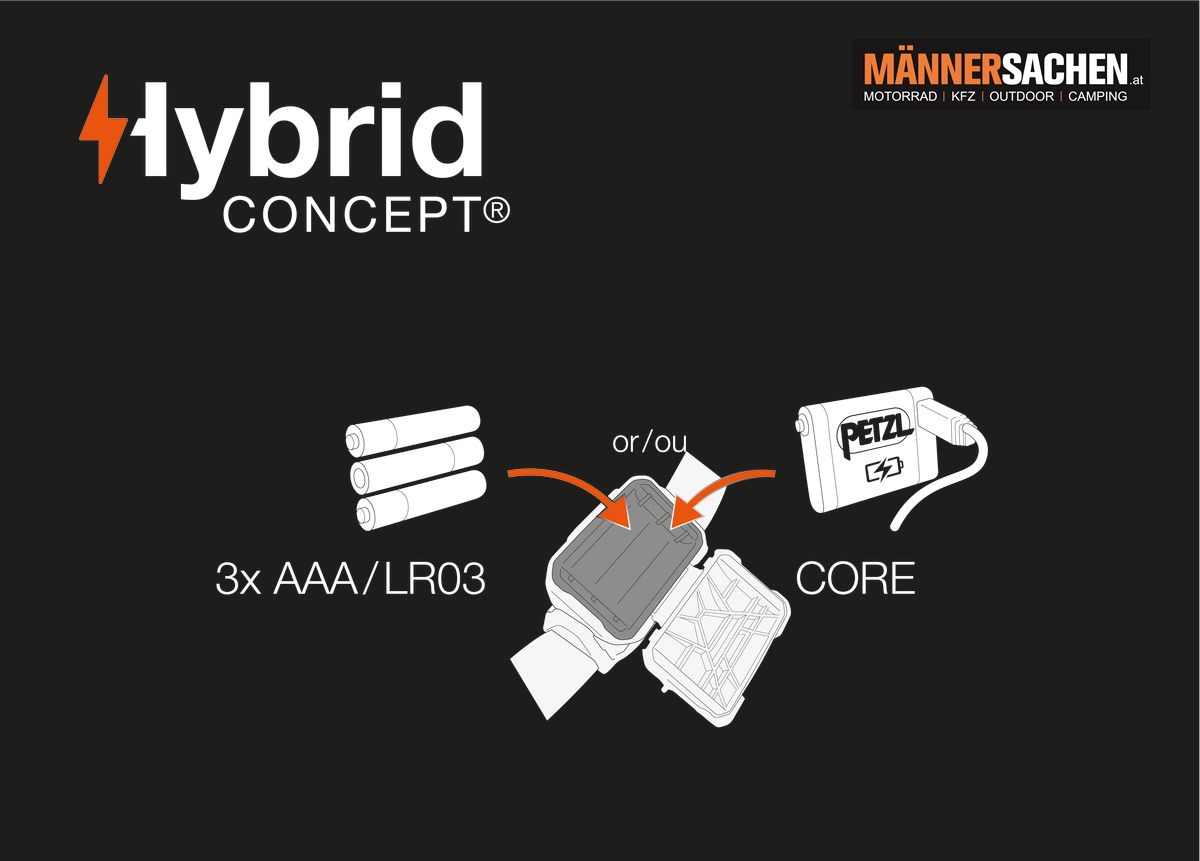 Betriebsmöglichkeiten: 3 AAA-/LR03-Batterien (enthalten) oder CORE-Akku (als Zubehör erhältlich)