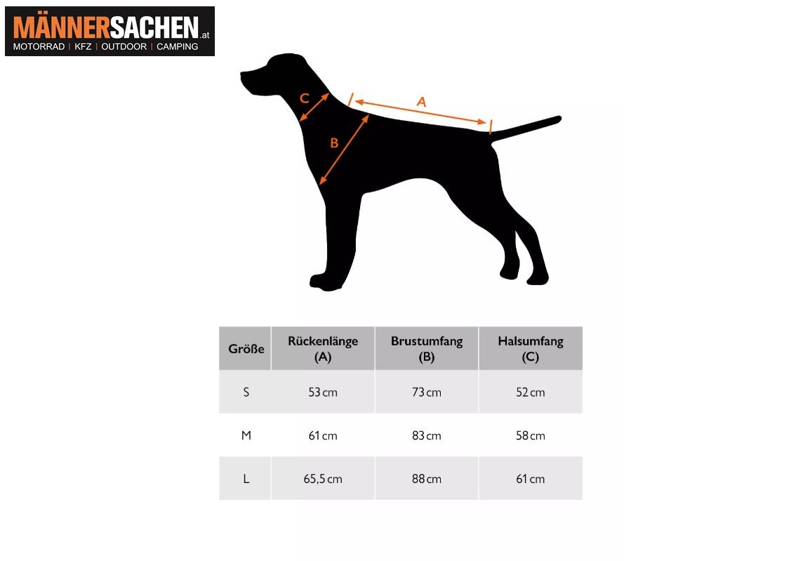 Nehmen Sie bitte VOR einer Bestellung genaues Maß an Ihrem Hund: Messen Sie dazu die Rückenlänge vom Hals bis über die Schwanzwurzel (s. Bild, Länge A) und messen Sie auch Brust- und Nackenlänge.