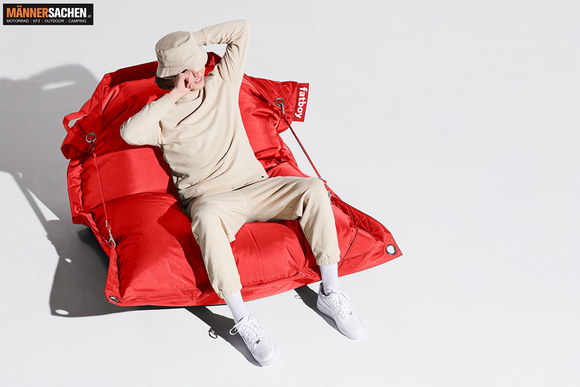 FATBOY Buggle-Up Outdoor - Relaxsessel für draußen  In den Farben Rot und Taupe erhältlich. Dieser outdoor Relaxsessel bleibt über zwei verstellbare Gurte in jeder Position stabil. Hergestellt ist er aus einem superstarken UV-, wasser- und schmutzabweisenden Gewebe Olefin. So bleibt er viele Jahre lang schön, in jeder Farbe. Buggle-up Outdoor ist in verschiedenen Farben erhältlich. Abmessung: 185 x 132 cm. 7,5 kg. Produkt + Verpackung: 10 kg. Verpackung: 60 x 60 x 110 cm. Inhalt: 350 Liter.   Sonstige Eigenschaften:  Geeignet für den Innen- und Außenbereich. Wasser- und schmutzabweisendes Material mit hervorragender Farbechtheit (100% solution dyed). Einfache Anpassung von Einzel- zu Doppel-Sitzecken. UV-abweisendes Gewebe. Füllung: EPS. Maschinenwaschbare Außentasche. Bezugsmaterial: 100% Olefin. Schmutzabweisend. Kann mit Bleiche gereinigt werden. Einfache Anpassung vom Einsitzer zum Zweisitzer.    Bewahre deinen Original Outdoor wie jedes andere Gartenkissen bei Regen drinnen auf. Durch intensive Nutzung kann die Füllung schrumpfen. Mit dem Nachfüllset kann der Sitzsack aufgefüllt werden (100 Liter). Bügel deinen Original regelmäßig, um seine wasserabweisende Eigenschaft aufrechtzuerhalten.   Bei weiteren Fragen stehen wir Ihnen gerne telefonisch oder per Mail zur Verfügung. 0676 - 911 999 0  office@maennersachen.at
