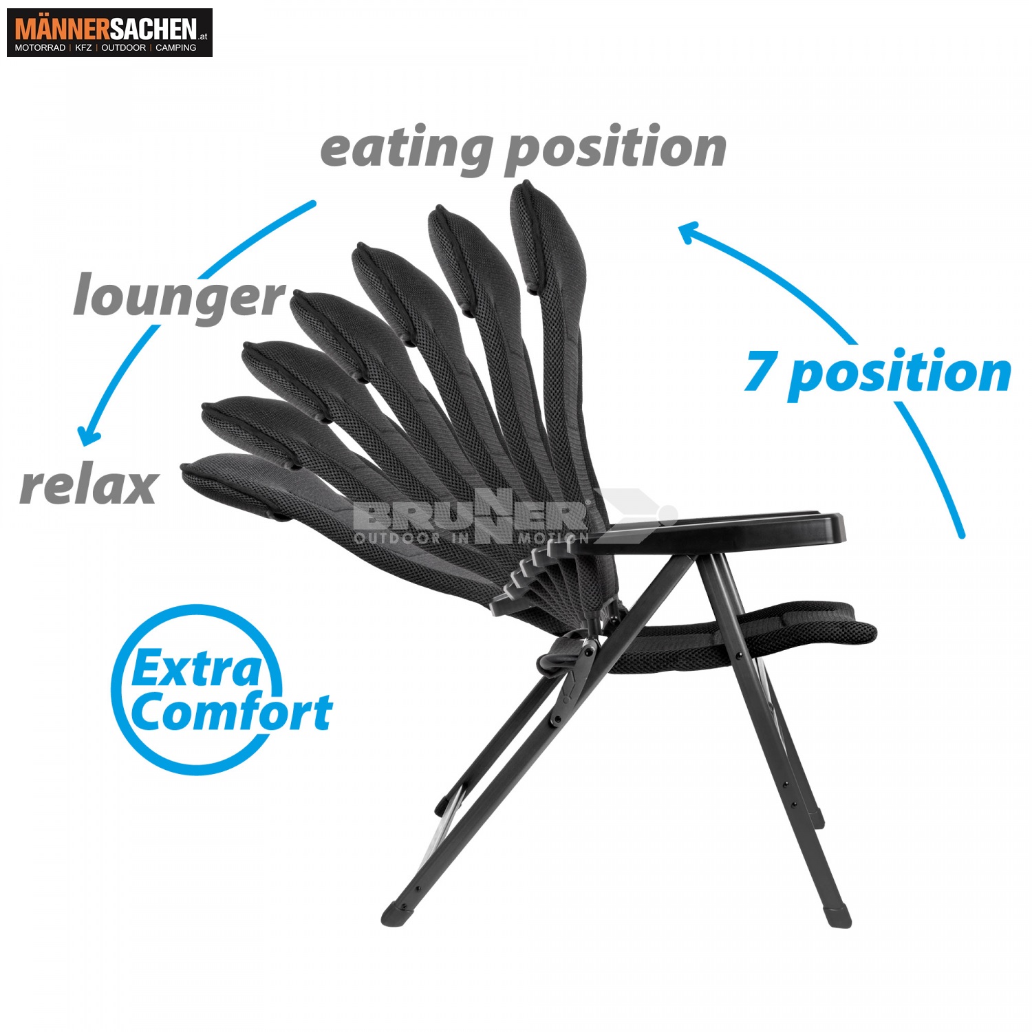 BRUNNER ARAVEL 3D Moderner, klappbarer Vierbein-Stuhl mit 7-fach verstellbarer Rückenlehne. Größen: S, M, L  Farbe: schwarz, grau Eigenschaften • Aluminium-Gestell aus hoch belastbarem Ovalprofil• Bezugsstoff: Atmungsaktives, gepolstertes 3D-Gewebe• Ergonomische, 7-fach verstellbare Rückenlehne• Rückenlehne mit integrierter, gepolsterter Kopfauflage• Armlehnen aus robustem Kunststoff• Zentralgelenk aus Stahl• Es besteht die Möglichkeit eine Beinauflage anzubringen• Sehr kompaktes und leicht zu transportierendes Packmaß Klicke HIER um ein Video des ARAVEL 3D zu sehen! Allgemein Gewebe: 3Durafeel Belastbarkeit / Tragfähigkeit: 150 kg Material: Aluminium Aravel 3D M grau Artikelnummer: 0404065N.C07M Maße offen: 47 x 44 x H48/121 cm Maße geschlossen: 114 x 64,5 x 10 cm Gewicht: 5,3 kg Aravel 3D S schwarz Artikelnummer: 0404065N.C09S Maße offen: 41 x 44 x H46,5/116 cm Maße geschlossen: 106,5 x 59,5 x 10 cm Gewicht: 5,2 kg Aravel 3D M schwarz  Artikelnummer: 0404065N.C09M Maße offen: 47 x 44 x H48/121 cm Maße geschlossen: 114 x 64,5 x 10 cm Gewicht: 5,3 kg Aravel 3D L schwarz Artikelnummer: 0404065N.C09L Maße offen: 49 x 44 x H50/126 cm Maße geschlossen: 117,5 x 67,5 x 10 cm Gewicht: 5,58 kg   Bei weiteren Fragen stehen wir Ihnen gerne telefonisch oder per Mail zur Verfügung. 0676 - 9119990  office@maennersachen.at