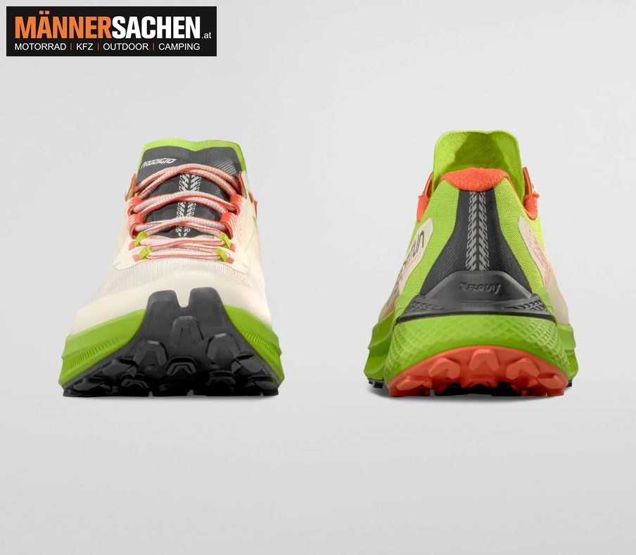 Die große Zehenkappe und der atmungsaktive Schaft sorgen auch nach mehreren Stunden Lauf für Komfort, die Wrapping System-Konstruktion und die perfekte Fersenergonomie gewährleisten Stabilität und Schutz, während die Rocker-Geometrie einen flüssigen und progressiven Schritt auf jedem Terrain unterstützt.
