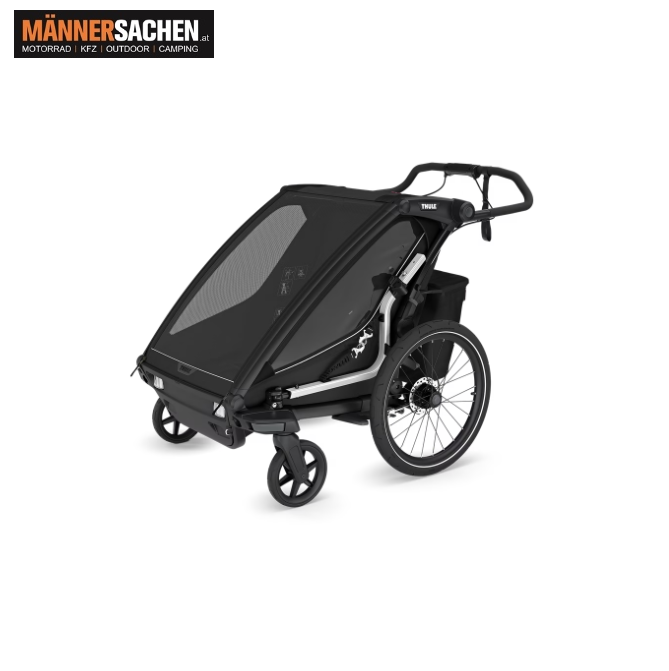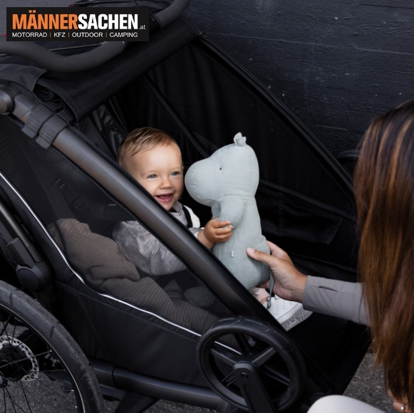 THULE Chariot Sport 2 double - Fahrradanhänger und Jogging-Kinderwagen  Farben: schwarz (10201031) oder natural gold (10201033) Klicken Sie HIER, um ein Video des Chariot Sport 2 zu sehen! Der modulare Fahrradanhänger und Jogging-Kinderwagen in einem – für das Training in allen Jahreszeiten sowie mühelose alltägliche Fahrten. Eigenschaften - Für Deine Aktivitäten entwickelt 4 Aktivitäten – speziell entwickelt zum Radfahren, Joggen, Spazieren und Skifahren (Jogging- und Skisets separat erhältlich). Das mitgelieferte Regenverdeck und die Sonnenblende halten Dein Kind trocken und schützen es vor der Sonne. - Modernes Design mit hochsichtbarer LED-Beleuchtung Integriertes LED-Licht, betrieben durch die Thule Powerbank 10k (separat erhältlich) für bessere Sichtbarkeit unter allen Bedingungen - Per Handhebel zu bedienende Scheibenbremsen Für mehr Kontrolle in steilem Gelände und beim Laufen - Vollständig gepolsterter, modularer Liegesitz Dank der modularen Sitzmöglichkeiten kannst Du wählen, ob ein Kind in der Mitte oder zwei Kinder auf beiden Seiten des Anhängers sitzen sollen. Praktische, mit einer Hand einstellbare Liegeposition und vollständig gepolsterte Sitze für ein Nickerchen unterwegs. - Einfach von einer Aktivität zur anderen wechseln Das neu gestaltete FlipWing-System ermöglicht einen noch einfacheren Wechsel zwischen Radfahren und Spazieren, da die Räder jetzt nach oben und unten geklappt werden können, während der Anhänger am Fahrrad befestigt ist - Befestigung der Deichsel mit einer Hand Mit der neuen Deichsel kann der Anhänger einfach und sicher mit einer Hand am Fahrrad befestigt und wieder abmontiert werden - Einstellbare Federung Einstellbare Federung, damit Du den Komfort der Fahrt individuell anpassen kannst, wenn Dein Kind wächst oder Du schwere Gegenstände im Anhänger transportierst - XL-Gepäckstauraum Großer Gepäckkorb mit Reißverschluss zur sicheren Aufbewahrung von Gegenständen, der für mehr Beinfreiheit beim Joggen verstaut werden kann - Kompakt zusammenklappbar Dank des kompakten und benutzerfreundlichen Klappmechanismus lässt sich das Produkt einfacher denn je transportieren - Klimatisierter Innenraum Klimatisierter Innenraum mit herausnehmbaren Fenstern und mehrfach verstellbarer Sonnenblende. Belüftungsöffnungen sorgen für eine optimale Luftzirkulation und Klimaregulierung, abnehmbare Klemmen sorgen für mehr Belüftung bei Verwendung eines Regenverdecks - Praktische Aufbewahrung Die Thule Click n’ Store bietet eine praktische Aufbewahrung der Spazier-, Jogging- und Radfahrsets am Kinderwagen, während eine andere Aktivität ausgeführt wird - Einfache Pflege Die komfortablen gepolsterten Sitze sind abnehmbar und leicht zu reinigen    Technische Daten Maximales Gewicht des Kindes: 2x22 kg Maximale Tragkraft des Kindertransporters: 42 kg Maße zusammengeklappt: 86.3 x 77.3 x 37.5 cm Gewicht: 17.7 kg Schulterbreite: 55.5 cm Sitzhöhe: 64 cm Kompatible Türbreite: 80 cm Sicherheitsgurt: 5-Punkt Erfüllt die Sicherheitsnormen Kinder: 1 oder 2    Bei Fragen einfach anrufen oder ein E-Mail schreiben! 0676 9119990 oder  office@maennersachen.at