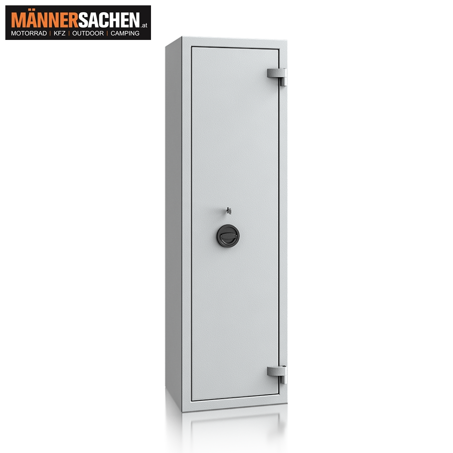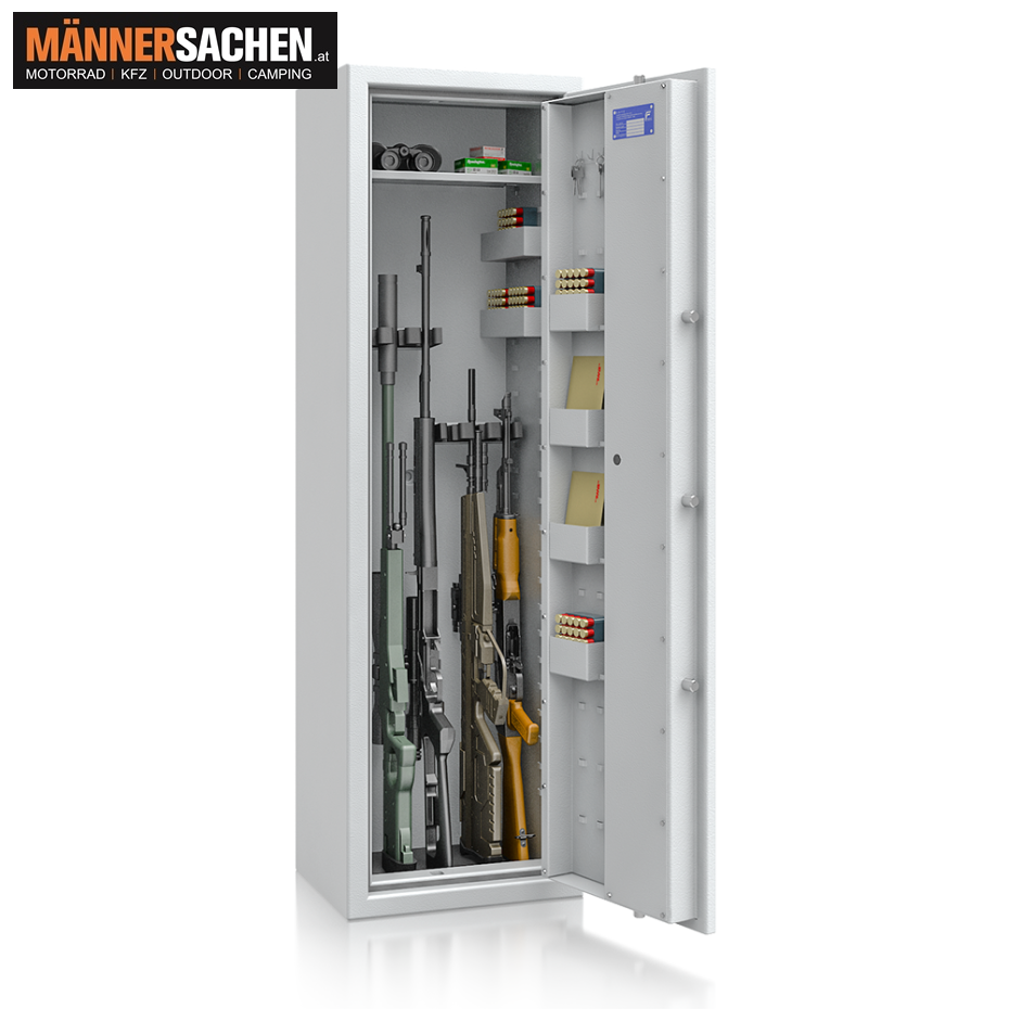 MÜLLER SAFE Waffenschrankmit Doppelbart-Hochsicherheitsschloss  MODELL : WFS 6 Farbe: Lichtgrau ( RAL 7035 ) Schloss: Doppelbartschloss Einbruchschutz: Sicherheitsstufe S1 nach EN 14450 Sicherheitsstufe A nach VDMA 24992 (Stand 05/1995) Bauart: Gehäuse: Einwandig Tür: Doppelwandig Scharniere: Innenliegend Türöffnungswinkel: 90° Griff/Beschlag: ca. 12 mm vorstehend Verankerung: 2 Bohrung im Boden, 2 in der Rückwand  Verschluss :  Doppelbart-Hochsicherheitsschloss 2 Schlüssel (Länge 65 mm) Technische Daten : Außenmaße in mm: 1450 x 280 x 320 Innenmaße in mm: 1245 x 274 x 255 Gewicht: 63 kg  Versicherungssumme: Privat bis 5.000,- € / Gewerblich bis 2.500,- € Bitte sprechen Sie mit Ihrem Versicherer, da die genannten Versicherungssummen je nach Risiko, Einsatzgebiet und Versicherer abweichen können! Für Fragen stehen wir sehr gerne zur Verfügung ! 0676 - 9119990