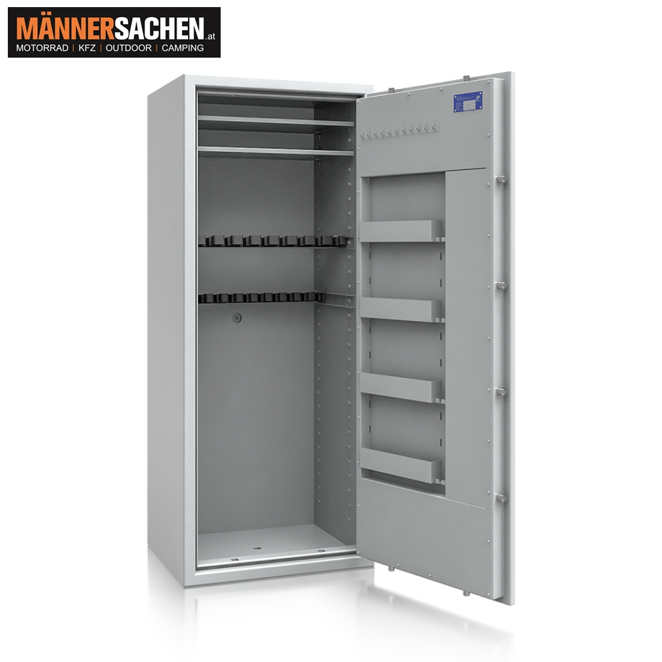 MÜLLER SAFE WAFFENSCHRANK  MODELL : WSL1-11/26 Farben: Lichtgrau RAL 7035, Graphitgrau RAL 7024 Schloss: Doppelbartschloss Einbruchschutz: Widerstandsgrad I nach EN 1143-1 zertifiziert durch ECB•S Bauart : Gehäuse: Doppelwandig Tür: Mehrwandig Scharniere: Außenliegend Türöffnungswinkel: 180° Griff/Beschlag: ca. 30 mm vorstehend Verankerung: 1 Buchse im Boden, 1 in der Rückwand (nicht durchgebohrt) Verschluss :  Kräftiges Zentralriegelwerk mit Doppelbart-Hochsicherheitsschloss 2 Schlüssel (95 mm) Technische Daten : Außenmaße in mm: 1600 x 850 x 500 Innenmaße in mm: 1550 x 800 x 390 Fachböden: 2 Stck Gewicht: 285 kg Versicherungssumme :  Privat bis 65.000,- € / Gewerblich bis 20.000,- € Bitte sprechen Sie mit Ihrem Versicherer, da die genannten Versicherungssummen je nach Risiko, Einsatzgebiet und Versicherer abweichen können. Für Fragen stehen wir sehr gerne zur Verfügung ! 0676 - 9119990