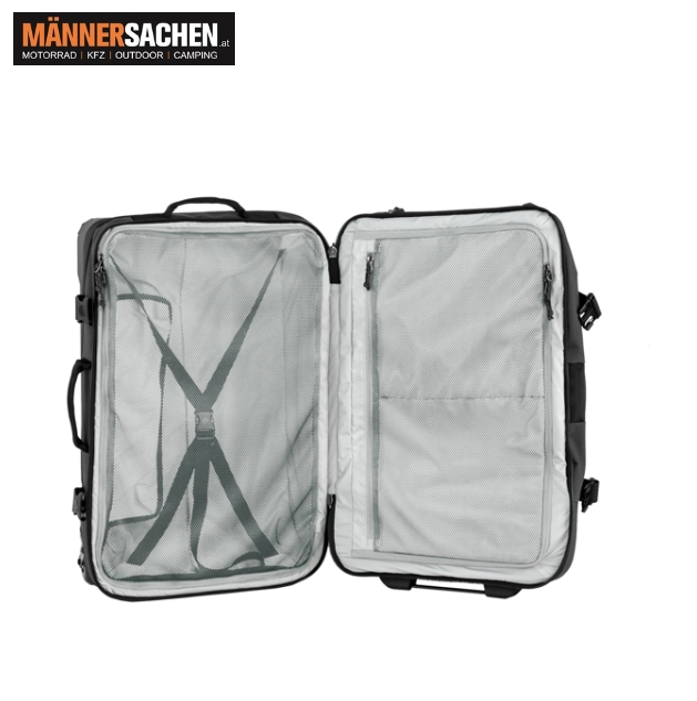 Kompressionsgurte außen, Bänder und ein Trennelement mit Mesh-Taschen innen halten den Inhalt am Platz.