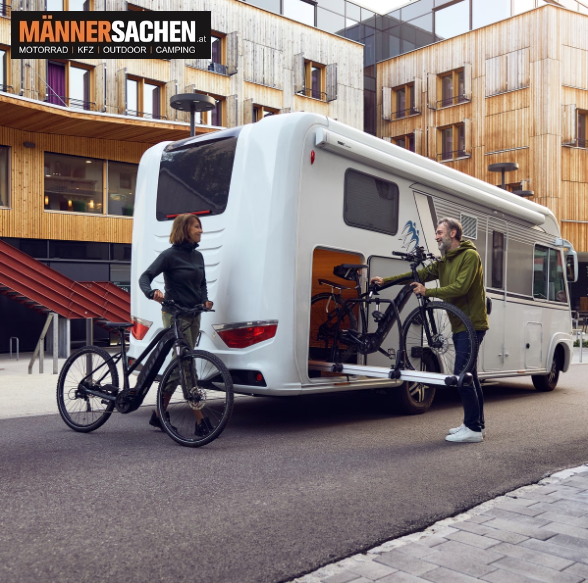 Der intelligenteste und benutzerfreundlichste Fahrradträger für die Garage Ihres Reisemobils – passend für bis zu 2 E-Bikes.