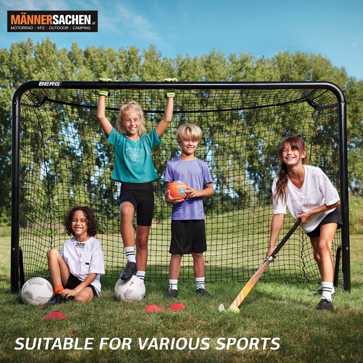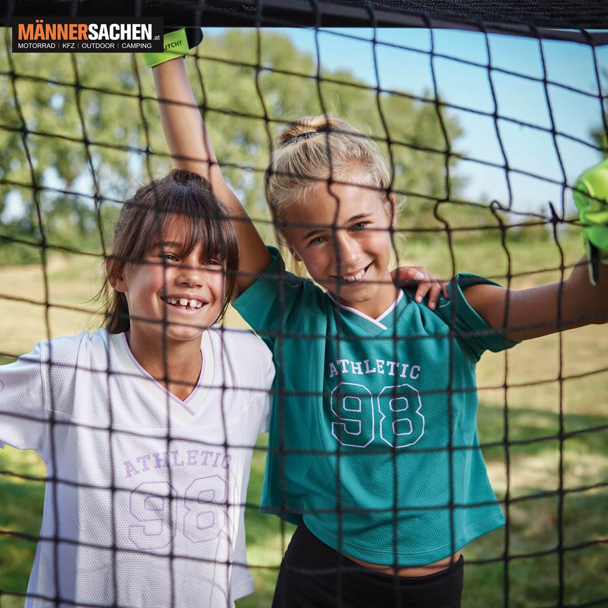 Der starke, robuste Rahmen sorgt dafür, dass das Netz immer richtig gespannt ist. Dank des feinmaschigen Netzes eignet sich das Tor hervorragend für verschiedene Ballsportarten: Es ist also nicht nur ein Fußballtor, sondern auch ein Handball- und Hockeytor.