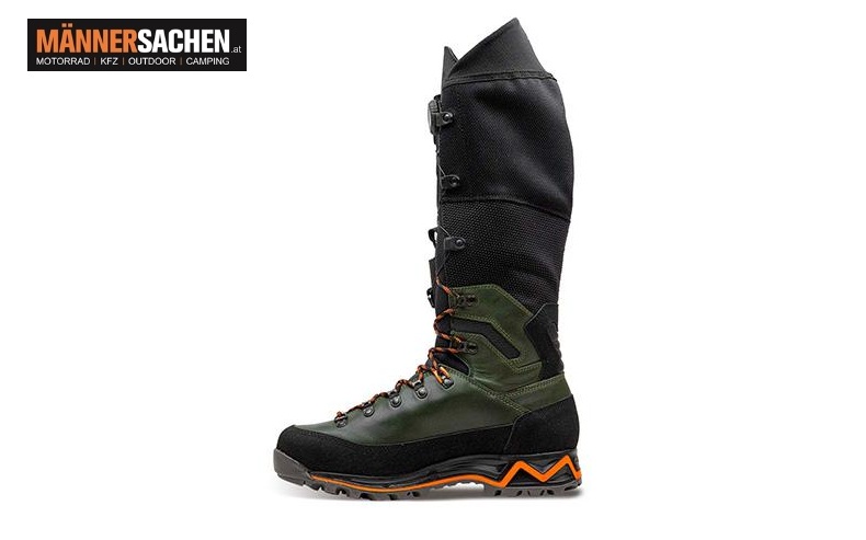 Eine einzigartige Lösung mit integrierter oberer Gamasche, die hohen Schutz bis zur Wade garantiert, schneller und präziser Schnürung und anatomischer Umhüllung vom Bein bis zum Fuß.