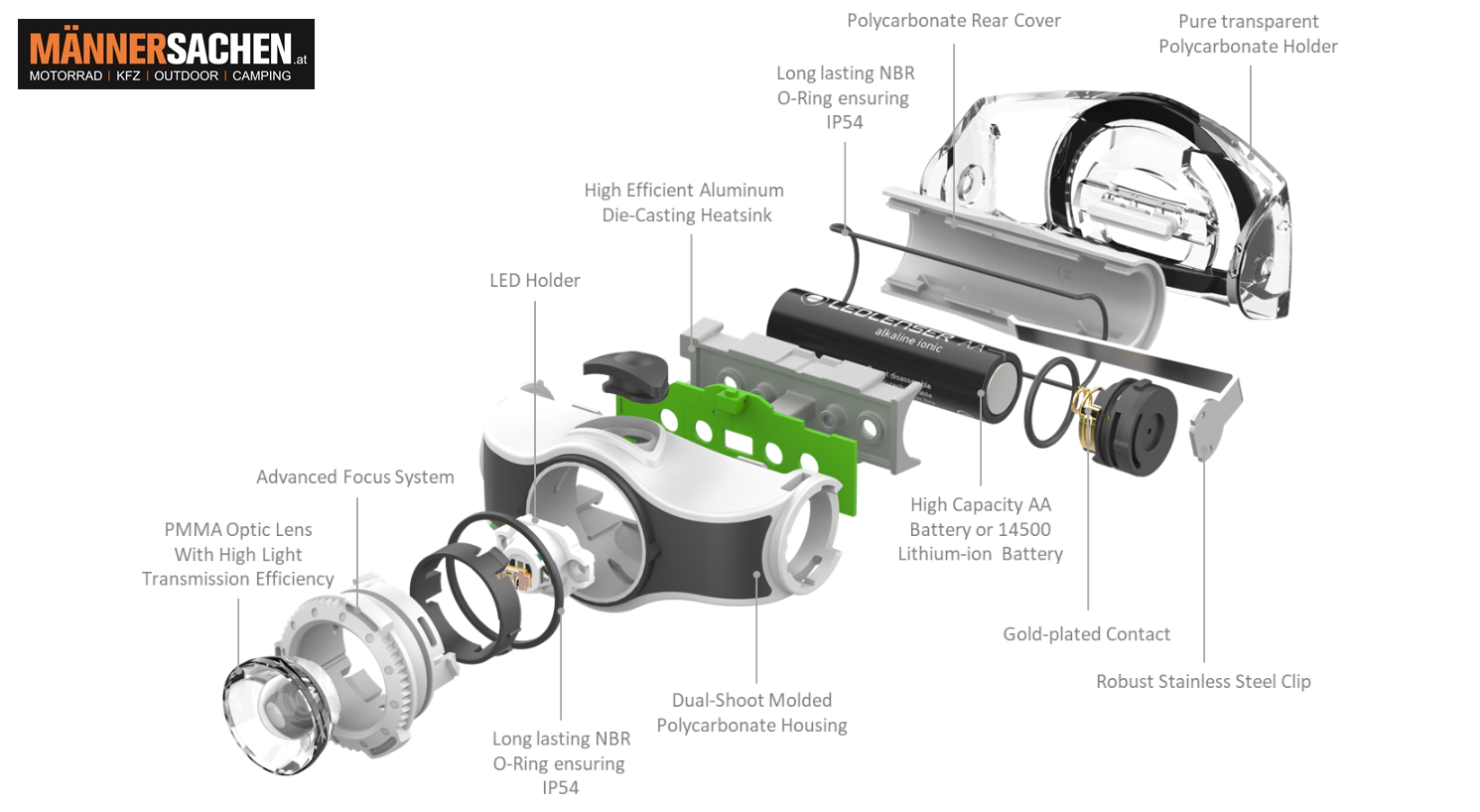 - Zusätzliche Rotlicht-LED an der Stirnseite für die Erhaltung der Nachtsichtfähigkeit