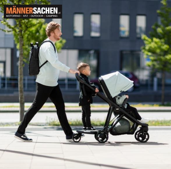 Mit dem Thule Rider Board kann ein älteres Kind einfach auf den Kinderwagen aufspringen und mitfahren – ein praktisches Trittbrett für alle, die lange Spaziergänge mit den Kindern lieben.