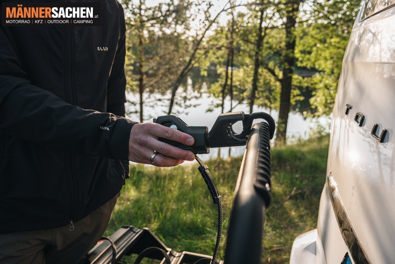 Ein Premium-Fahrradträger für die Anhängerkupplung, mit einem praktischen Befestigungssystem, erweiterter Radstandkapazität und einfacher, intuitiver Handhabung.