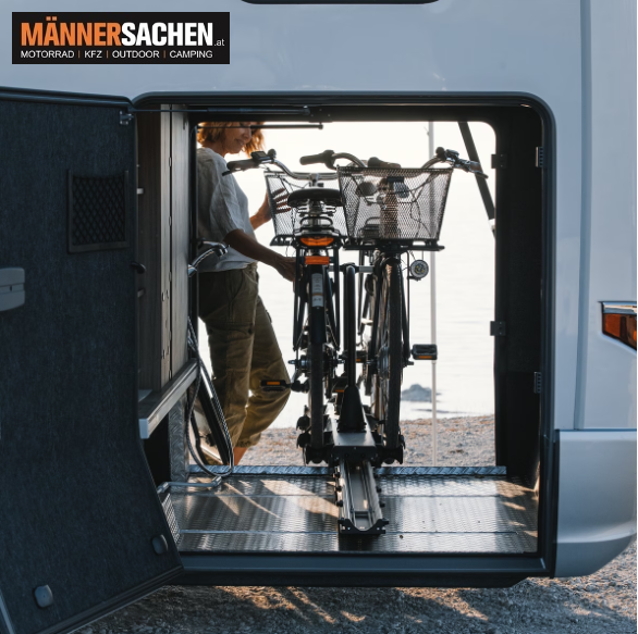 Perfekter Fahrradträger zum Transport von zwei Elektrofahrrädern auf der Caravandeichsel.
