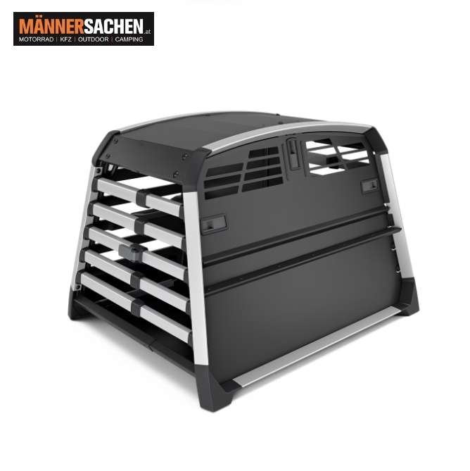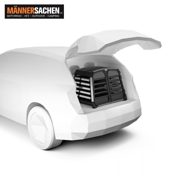 Die sichere, zuverlässige und einfach zu nutzende Hundebox für das Auto, die sowohl Hund als auch Menschen schützt. Geeignet für bis zu zwei Hunde.