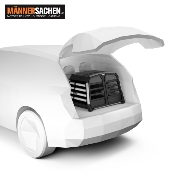 Die sichere, zuverlässige und einfach zu nutzende Hundebox für das Auto, die sowohl Hund als auch Menschen schützt. Geeignet für bis zu zwei Hunde.